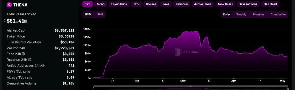 Thena于今年1月上線,目前TVL在BNBchain上排名第9,也是最早實現了集中流動性功能的ve(3,3)Dex。
