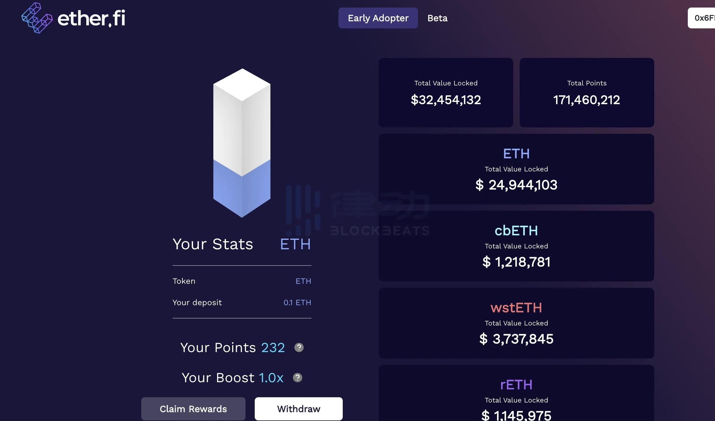 界面會顯示獲得的積分和獲得積分的倍數,積分大概率與即將空投的ETHFItoken有關,且積分可以在該項目正式上線以太坊主網時獲得獎勵,質押以增加收益。