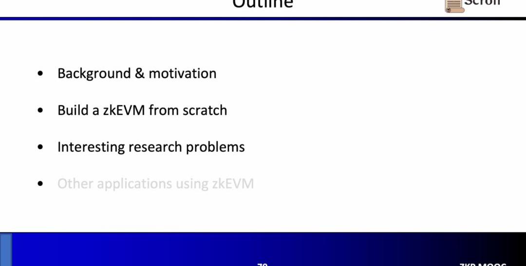 演講分成四個部分,第一部分張燁介紹了開發背景以及我們為什么首先需要zkEVM以及為什么它在最近兩年間變得如此受歡迎,第二部分通過一個完整的流程,講解如何從頭開始構建zkEVM包括算術化和證明系統,第三部分通過一些有趣的研究問題來談論了Scroll在構建zkEVM時遇到的問題,最后介紹了一些其他使用zkEVM的應用。