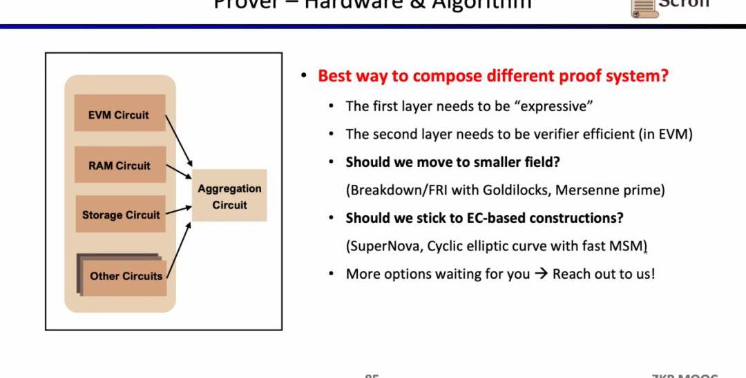 第三部分,張燁談論了一些Scroll在構建zkEVM過程中有趣的研究問題,從前端的算術化電路到證明者的實現。