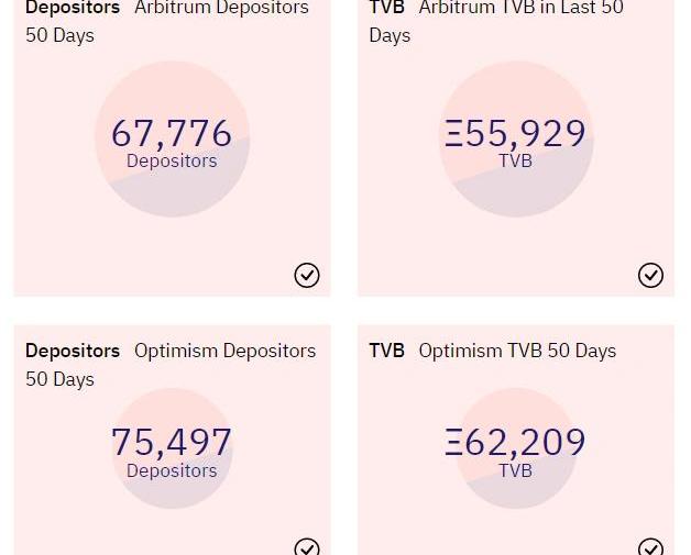 右上角圖標顯示最近50天Arbitrum的TVB,近50天橋接到Arbitrum的資產達到55,929個ETH;右下角圖表顯示最近50天Optimism的TVB,近50天橋接到Optimism的資產達到62,209個ETH。Optimism同期TVB領先Arbitrum11.2%。