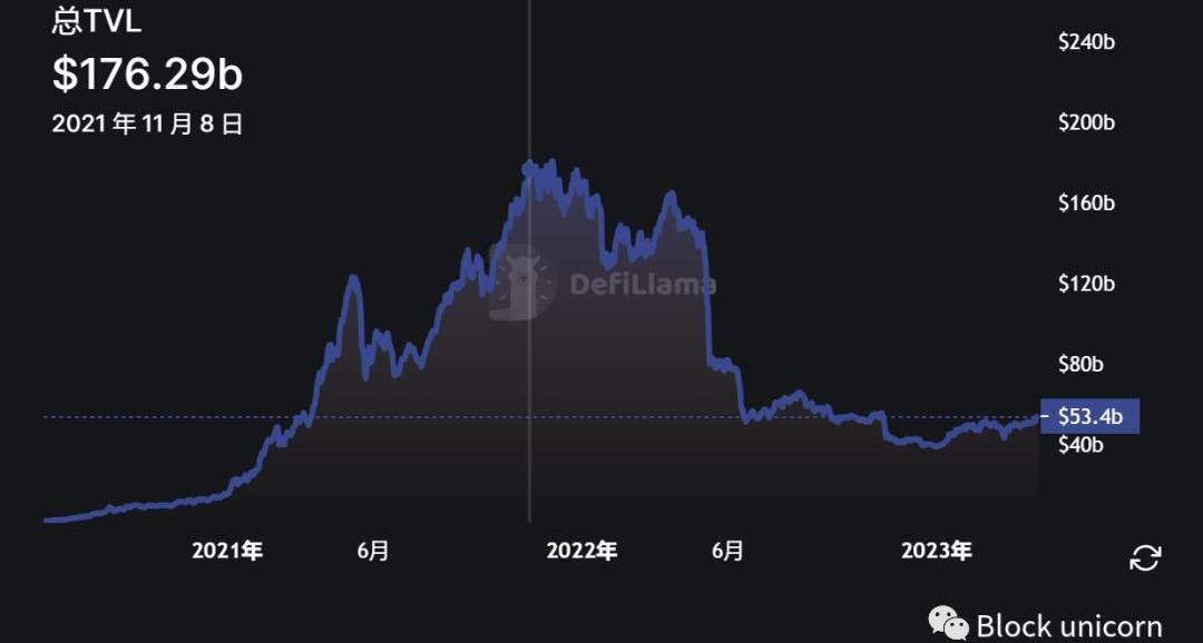 DeFiSummer流動性質押挖礦激勵持續到了2021年11月,把defi的TVL推高到了1762億美元。在達到歷史高點后,由于大環境經濟形式惡化,層出不窮的黑客事件、監管風險等因素,使DeFi?Summer的熱度難以繼續維持。