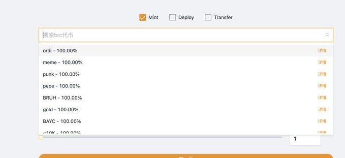 2.進入https://idclub.xyz/brc20,下拉框選擇brc銘刻,搜索想要mint的代幣,后面附帶mint進度,100%表示已經mint完。