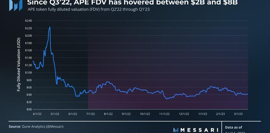 自22年第三季度以來,APE的FDV一直徘徊在20億美元至80億美元之間。23年第一季度沒有低于35億美元。與更廣泛的加密市場相比,APE在2023年第一季度的價值保持得相對較好,盡管比ATH下跌了70%以上。此外,FDV季度環比增長20.6%。