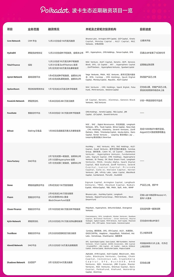 通過梳理可以發現,近期融資明顯加速,在統計的案例中,12 月完成融資了 3 筆融資,分別是 Cere Network、HydraDX 和? Tidal Finance ;1 月完成了 5 筆融資,分別是 Apron Network、OptionRoom 、 ParaLink Network、ParaState 、Bifrost ;2 月完成了 7 筆融資,分別是 Dora Factory、Stone 、Plasm 、Clover Finance、Kylin Network、TrustBase 、Idavoll Network ;3 月截止到 3 日完成了 5 筆融資, 分別是 Tidal Finance、Apron Network、 Dora Factory、Plasm 、Shadows Network。