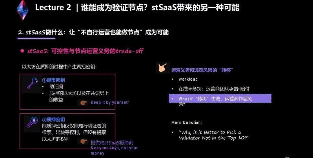 另外一個點就是質押模式的風險的解決方案。因為站在SSV的角度,我們希望把這個問題解決掉。如果私鑰不在自己手里,晚上會睡不著覺。而SSV解決的問題就是讓你的提款私鑰放在自己的手里。如果說你的私鑰不丟失,你的幣就不會丟失,這個就是核心的“don'ttrust,justverify”。