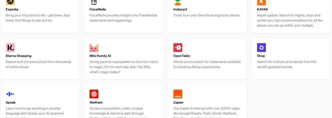 OpenAI的解決方案是用第三方插件作為橋梁,讓AI在較安全的環境下「看」外界數據。昨天該機構開放了第一批ChatGPT插件名單。這批插件由Expedia、FiscalNote、Instacart、KAYAK、Klarna、Milo、OpenTable、Shopify、Slack、Speak、Wolfram和Zapier創建。