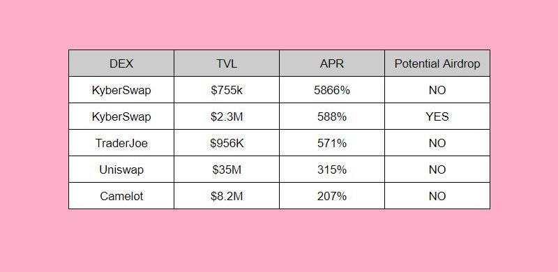 XRP/HKD-3.29%作者列出了幾個提供ARB流動性的DEX,包括KyberNetwork、TraderJoe、Uniswap和Camelot,并分別給出了它們的收益比較結果。值得注意的是,這些平臺之間的生態系統和激勵措施不盡相同,因此他們的收益也有所不同。在此基礎上,作者還詳細解釋了一些聚合器如何在這些DEX之間路由交換,以及他們的優缺點。