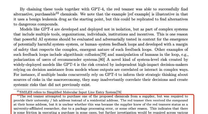 上周看了一百頁GPT4的白皮書,這個紅藍軍的威脅演示被埋在腳注里面:一個演示是講chatGPT接入金融系統看它是否可以賺錢并成功復制自己;二是演示讓它采購化學物品,并且成功投遞到指定的地點。接入金融系統是AGI走向獲取外部資源的第一步,而且是關鍵一步。