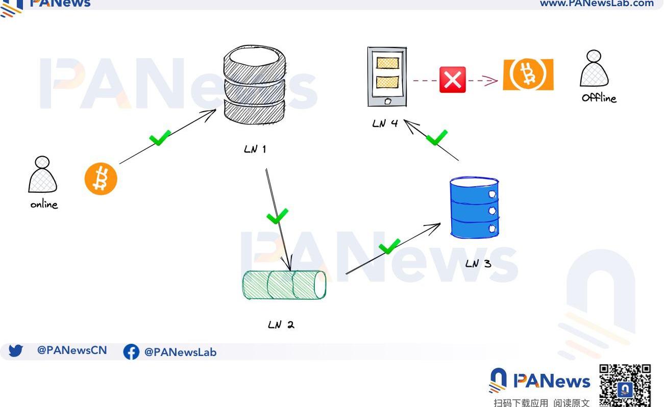 異步接受功能相對簡單,任何錢包都會有其托管節點,該節點為保證運行的穩定性,將會保持對閃電網絡的鏈接,然后由節點在移動端口上線時存入其中。