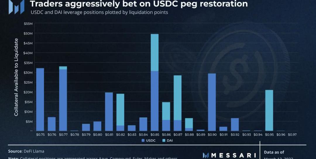 雖然像USDT這樣理想的穩定幣的借貸利率飆升,但還有另一陣營的參與者認為掛鉤會迅速恢復并使用鏈上貨幣市場來押注USDC。這些交易員持有大量杠桿USDC和DAI的頭寸,其清算點接近交易價格。