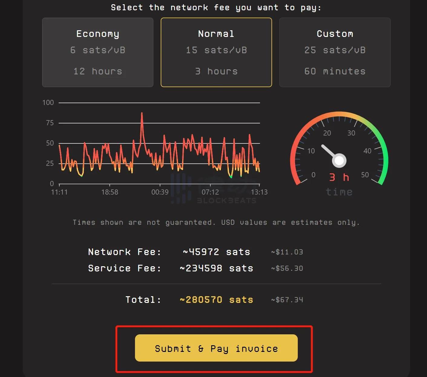 「Copyaddressbelow」下方顯示的是打款地址,「TotalAmount」顯示的是打款金額。使用自己的比特幣錢包完成轉賬以后等待銘文到賬即可。