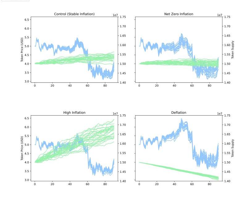 通過模擬,我們發現控制組穩定性最高。高通脹率略微降低了我們的代幣價格,但并沒有太大損失穩定性,而通縮導致代幣價格略微上升但穩定性較差。