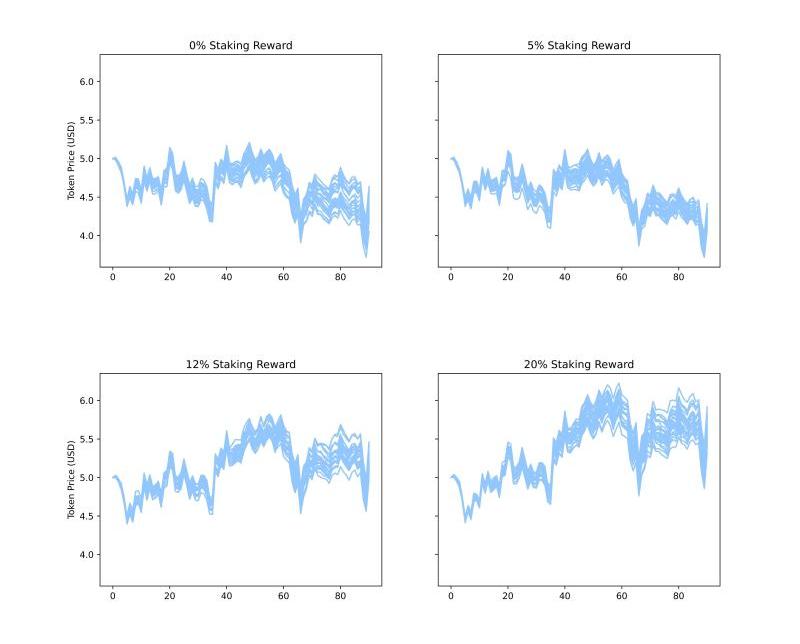 這些結果表明,在質押回報率上存在一個“平衡點”,在這個點上,協議設計者必須平衡資本流量和投機者數量的增加。在我們的實驗經濟中,12%是最接近這個平衡點的結果,給我們帶來了明顯的代幣價格增長,同時穩定性損失很小。當我們將我們的模擬用作咨詢工具時,我們可以掃描更多的質押水平或模擬不同的獎勵計劃,以獲得更高的分析精度。
