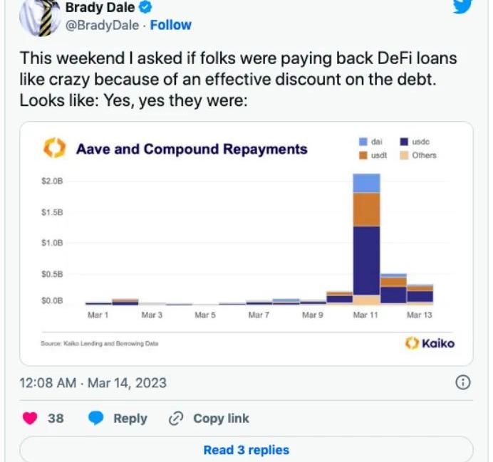 Axios記者BradyDale說,與此同時,許多人利用這個機會以較低的價格償還他們以美元計價的DeFi貸款,DeFi借貸平臺Aave和Compound上的還款在周六激增。在這種情況下,用戶可以通過購買更為便宜的USDC來償還貸款。