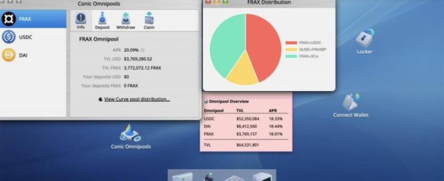 Conic在Curve上提供omnipools(將用戶流動性分散到不同的池中,并將其抵押在Convex上)。用戶賺取CRV+CVX+CNC