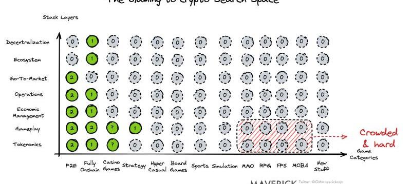 橫向:有許多游戲類型,每個類型都有自己的領域專業知識、目標受眾、游戲玩法和游戲內動態。垂直:一個成功和盈利的游戲產品需要大多數層次結合在一起:代幣經濟、游戲玩法、GTM、運營、經濟管理、生態系統和去中心化等等。一個薄弱的層次可能很容易摧毀整個體驗。由于加密貨幣+游戲是如此新穎,還沒有針對任何單一層的嘗試和驗證設計。找到單個單元的最優解已經很難了。找到能夠共同工作的垂直線則更是難了幾個數量級。我們相信,在找到全棧解決方案之前,我們將看到更多的迭代、實驗和試錯。單元格:每個單元格中的數字表示加密空間已經看到的相對成功的嘗試次數。即使最終失敗,每個成功的游戲都將推動加密的集體專業知識向前發展,并使我們更接近最終解決一個或兩個單元格。迄今為止,最知名的迭代發生在P2E、完全基于鏈上、賭場游戲和策略游戲。集體探索:加密游戲領域的建設者們建立和迭代他們的產品,以便我們擁有更多更高數字的綠點。隨著我們積累集體專業知識、才華、經驗、最佳實踐和案例研究,我們在概率上越來越接近創造正確的加密游戲。