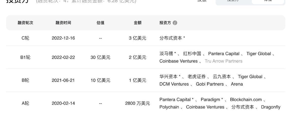 融資:累計融資4次,融資總金額為6.28億美元。主要投資方有分布式資本、TigerGlobal、CoinbaseVentures、PanteraCapital、紅杉中國等。