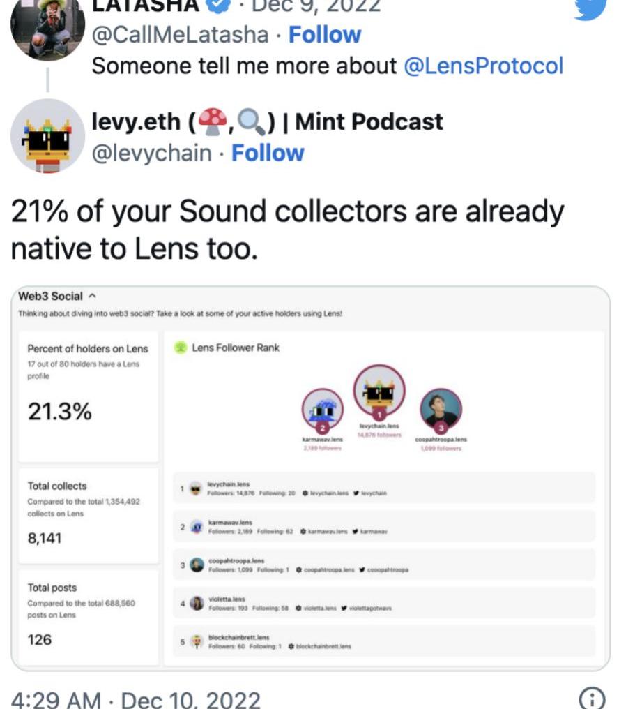 我也希望看到傳統品牌嘗試他們的Web3社交存在和形象。藍精靈協會,是的,我們兒時的最愛,與Lens合作,向Lens賬戶持有者獨家發布他們的Web3游戲。這是壓倒性的成功,在一個周末推動了3萬個錢包玩游戲,占所有Lens協議檔案的五分之一。