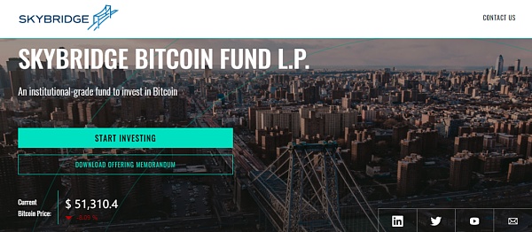 2021年1月4日,美國投資管理公司天橋資本(SkyBridge Capital)宣布推出比特幣基金——SkyBridge Bitcoin Fund L.P. ,為投資者提供對比特幣進行投資的機構級別的工具。在啟動前天橋資本及其關聯公司已經向該基金注資 2530 萬美元。此外,天橋資本代表其旗艦基金在2020年11月及12月投資于比特幣的基金頭寸已達3.1億美元。