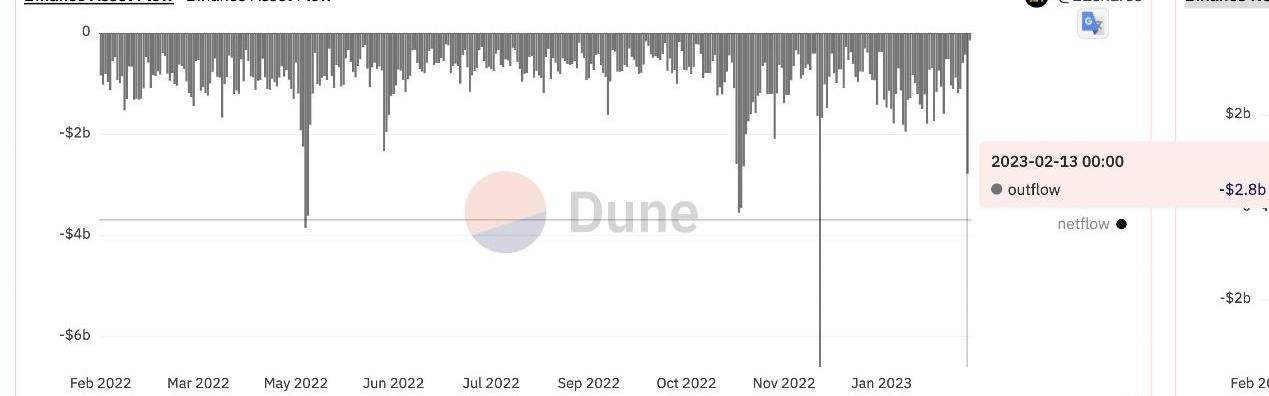 據DuneAnalytics數據顯示,2月13日,大約有價值28億美元的加密資產從幣安交易所流出。