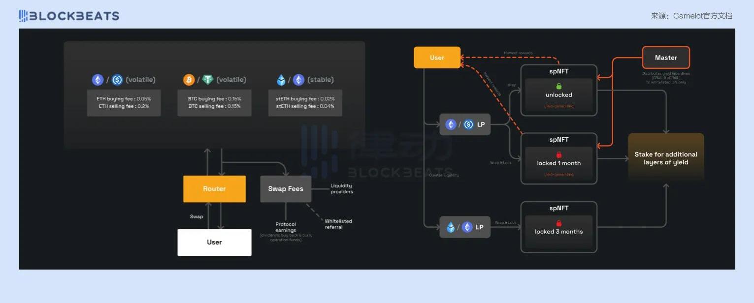 Camelot采用雙AMM模型,同時支持波動性和穩定性Token對交易。波動交易對由不相關的資產組成,基于通常的UniV2模型,使用標準常數乘積公式,而穩定交易對則由掛鉤或關聯型資產組成,兌換多保持在1:1的比例,使用Solidly曲線。除此之外,協議上的交易對采用動態定向費用,以為每個資金池設置不同的費用,并且可以根據交易買賣方向的不同定義費用。這種新的AMM機制使Camelot能夠提供更加定制化和針對特定交易對量身定制的礦池配置。