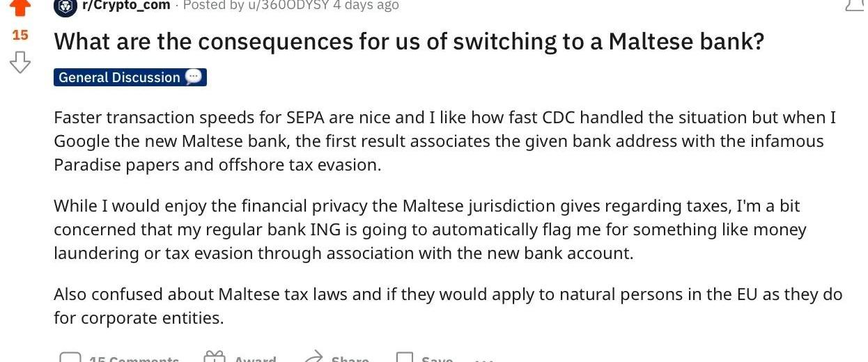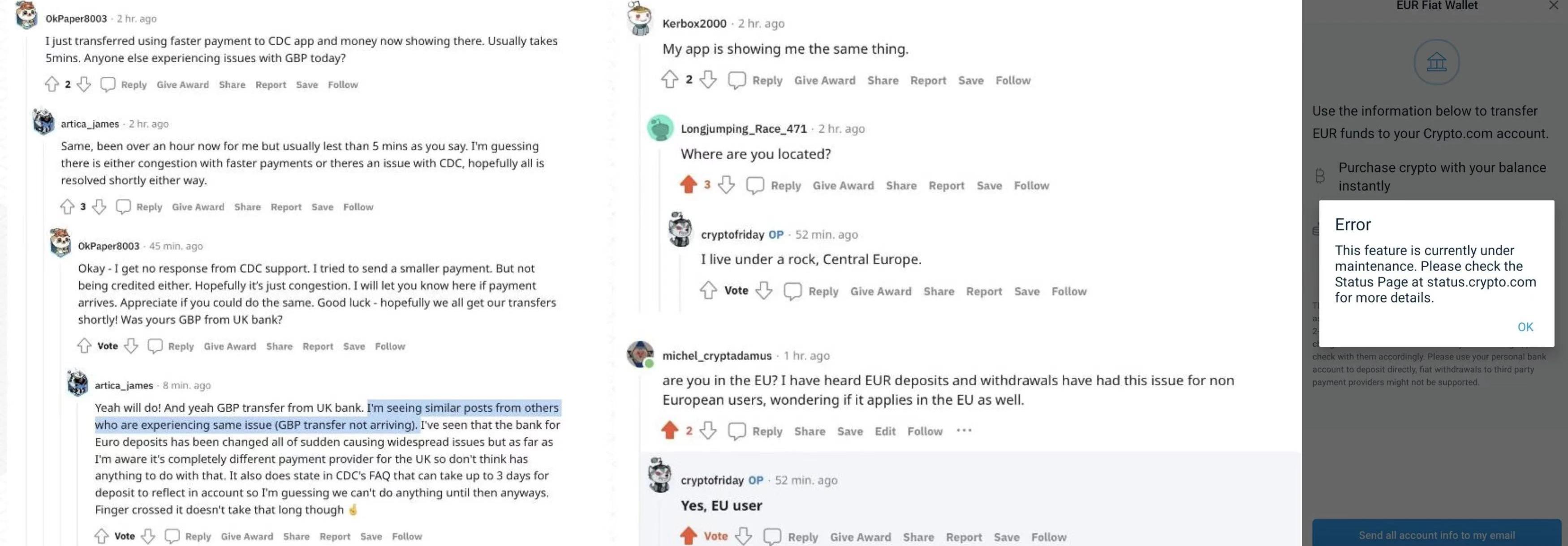 拋開透明度、合規性不談,Crypto.com找的新合作伙伴也經常掉鏈子,匯款服務經常中斷。有歐盟區用戶在Riddit發帖稱,Crypto.com應用程序中匯款和取款再次被禁用;還有一些用戶試圖通過英國的「FasterPayments」將英鎊存入馬耳他的新賬戶,也遭遇一系列問題。