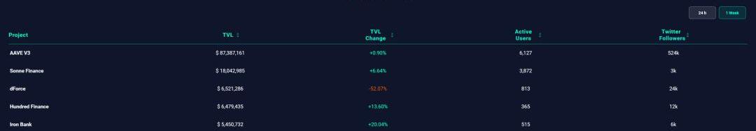 SonneFinance是OP的原生借貸平臺,也是借貸項目中TVL第二大的。該平臺為wETH、USDC、USDT、DAI、OP、sUSD、wBTC和SNX提供貨幣市場。Sonne在他們的代幣戰略中使用了Velodrome,因為他們并不簡單地用SONNE代幣獎勵流動性提供者。相反,他們用SONNE代幣賄賂VELO持有者,讓他們投票給SONNE/USDC對,而質押SONNE代幣的用戶反而獲得了VELO獎勵。OP有機會以Velodrome為基礎搭建起自己的原生DeFi樂高,而Sonne是借貸這一塊。其余的借貸平臺,如dForce,HundredFinance等都是多鏈部署的借貸協議,但是整體的TVL、LTV都不算太強勢。