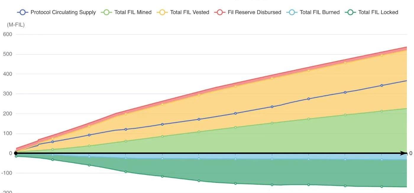 簡單來說,鑄造,歸屬,鎖定和燃燒有助于流通供應中代幣的凈流入或流出。下面是自主網推出以來?Filecoin?代幣供應的演變。