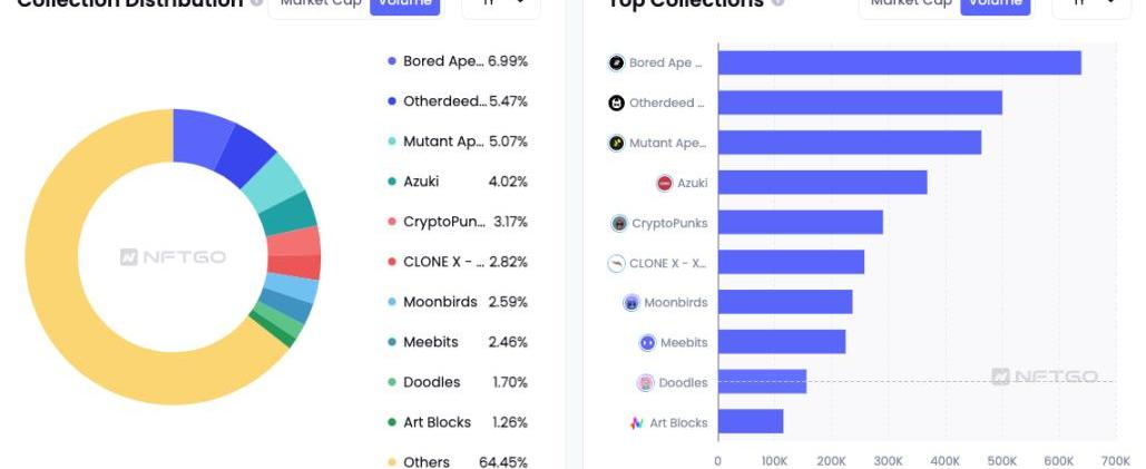 在NFT市場的交易量上,藍籌NFT一直占有主要優勢。從過去一年的NFTCollections總交易量對比來看,藍籌項目BAYC榮登榜首,交易規模總量達639KETH,占據最大的7%的交易總量,與之接近的是同屬于YugaLabs生態的Otherdeeds和MAYC,交易量分別占據5.47%和5.07%。