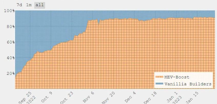 此外,參與MEV的門檻也越來越高,導致了進一步的中心化。這部分是由于搜索者必須對MEV機器人進行不斷的維護的事實。競爭是粗暴的,代碼也在不斷更新。如果你找到一個優勢,你更有可能不分享它,盡管區塊鏈是開放的賬本,它們最終會被發現。MEV“市場”,如Flashbots,也是相當中心化的,因為絕大多數區塊都是通過Flashbots流動的,盡管MEV-Boost中繼是去權限的,并且有好幾個終端。