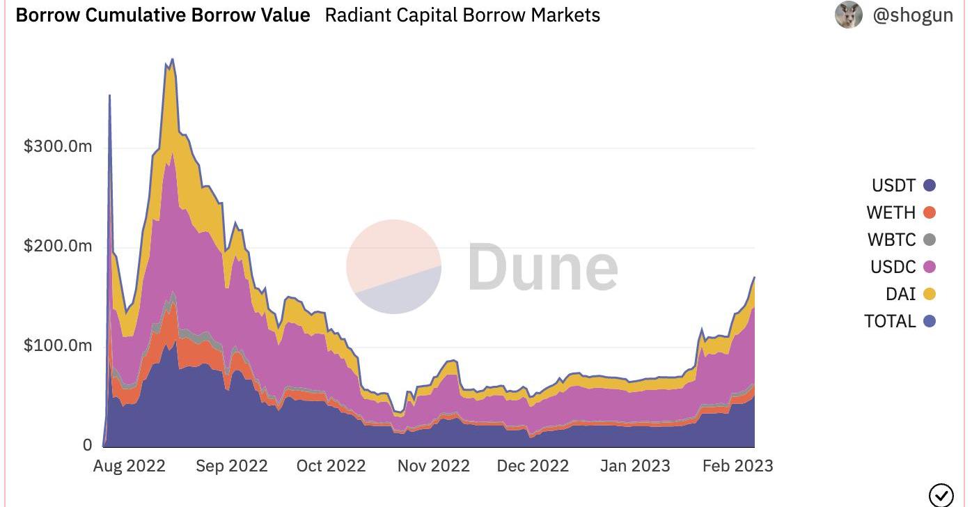 根據DuneAnalytics@Shogun整理的數據,Radiant上的總存款近期持續升高,目前約2.4億美元,其中包括USDC1.06億美元、USDT6646萬美元、DAI3836萬美元、ETH2057萬美元、WBTC961萬美元。三大穩定幣在存款中的占比之和達到了87.5%,其余只剩下少量ETH和WBTC。