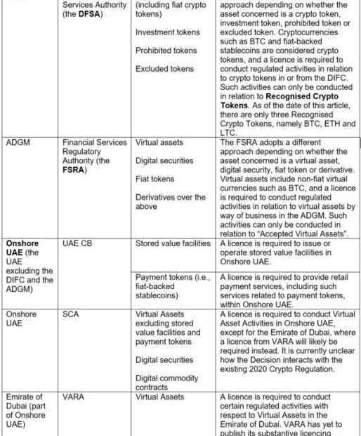 同時,阿聯酋央行也更新了StoredValueFacilities(SVF)Regulation以負責監管如法定貨幣、穩定幣等儲值型或支付型代幣,這些虛擬貨幣的種類不在CAAR的監管范圍內。