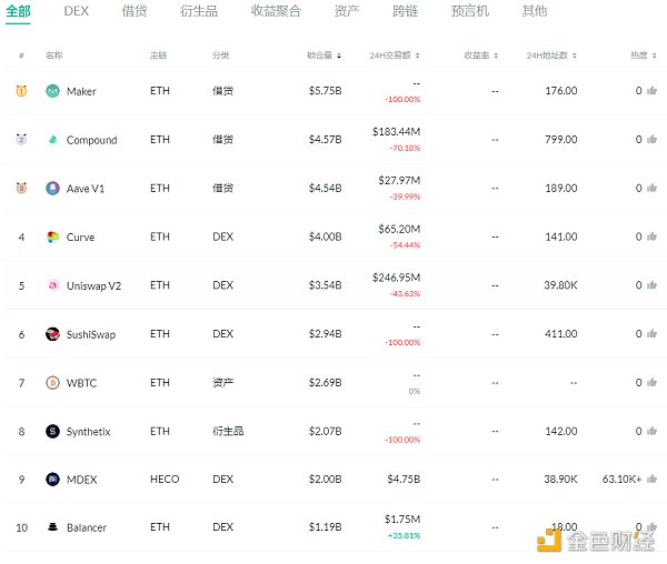 DeFi項目鎖定資產前十排名及鎖倉量,數據來源:Debank