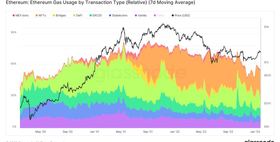 Defi以8%的份額位居第二,以淺綠色區域為代表。自暴漲開始以來,NFT和Defi類別的gas份額均有所增加。ERC20類別占gas總份額的8%。以深綠色區域為代表,該類別的份額從2022年10月的16%減半。