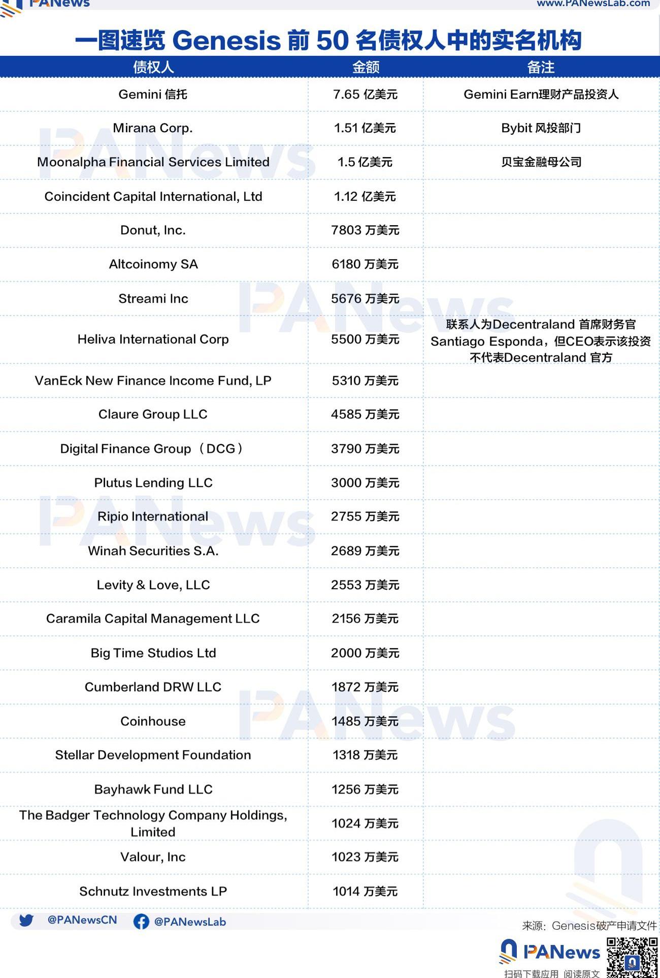 欠GeminiTrustCompany公司約7.66億美元;欠交易巨頭CumberlandDRW約1870萬美元;欠加密貨幣基金Mirana約1.515億美元;欠MoonAlphaFinance約1.5億美元;欠VanEck的NewFinanceIncomeFund基金約5300萬美元;欠HelivaInternationalCorp公司約5500萬美元。
