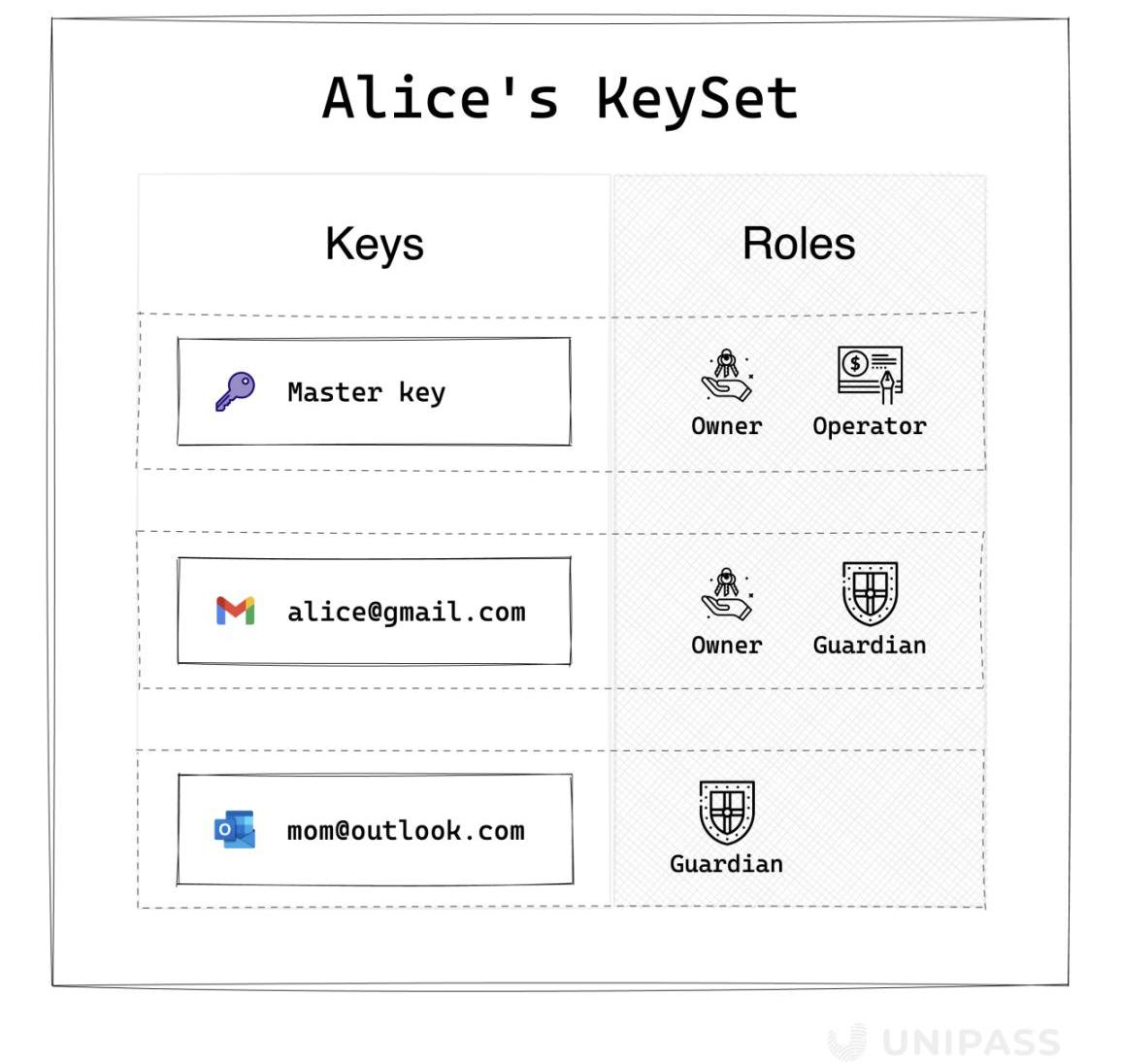我們經常使用的外部地址,支持EIP-1271協議的合約賬戶。UniPass的用戶還可以使用郵箱來作為密鑰。我們在鏈上部署的智能合約,可以通過DKIM來以密碼學的手段驗證用戶對于一個互聯網郵箱的所有權。在驗證過程中,UniPass采用了零知識證明技術,確保用戶郵件信息的隱私安全。在未來,UniPassWallet還將考慮支持相比于secp256k1更高效更簡潔的簽名算法,后量子安全簽名算法等等。秘鑰主要有三種角色: