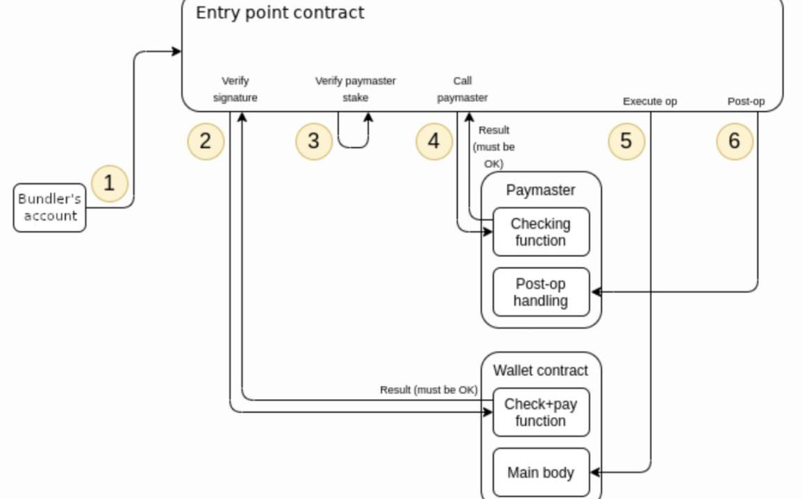 驗證循環:入口點合約通過每個UserOperation并調用SenderContract中的「檢查功能」。SenderContract運行此功能以檢查UserOperation的簽名并補償打包這些交易的Bunder。