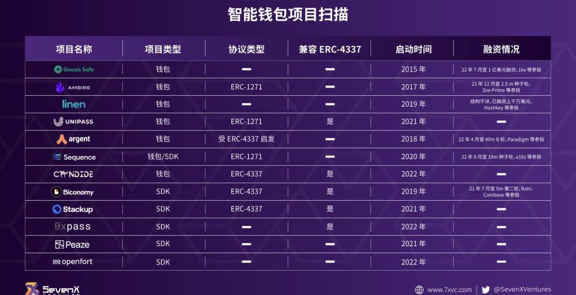 SevenX對市場上的智能合約錢包進行了簡單掃描,收集整理了一些市場上比較主流的智能合約錢包項目,其綜合情況如下: