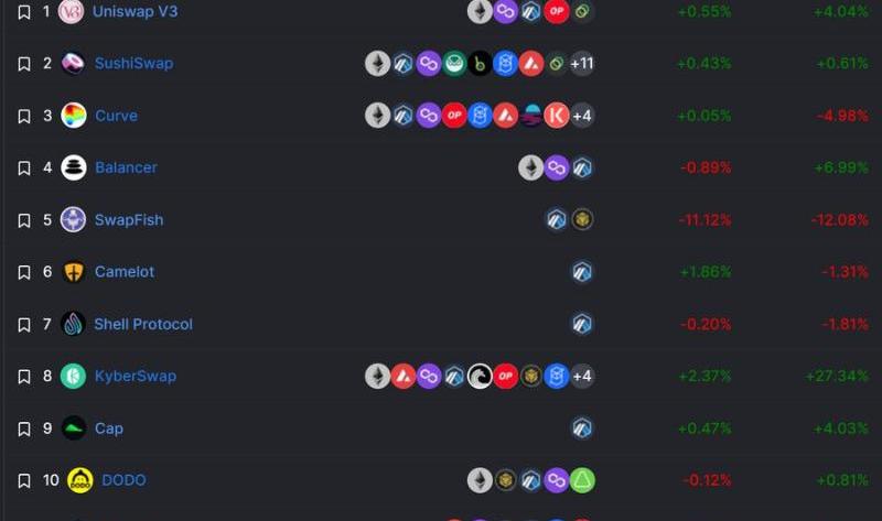 讓我們看看過去一個月的一些情況,Uniswap在Arbitrum上吸引了超過11億美元的交易量,占據近78%的主導地位,而SushiSwap占據了約13%。