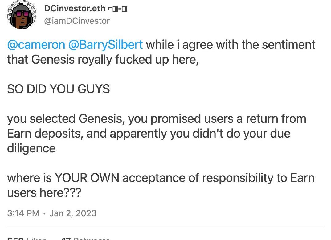 雖然我絕不是在暗示Winklevii應該為Genesis的失誤承擔經濟負擔,也不是說Earn儲戶沒有意識到他們所承擔的風險,但這聽起來確實有點像五十步笑百步……