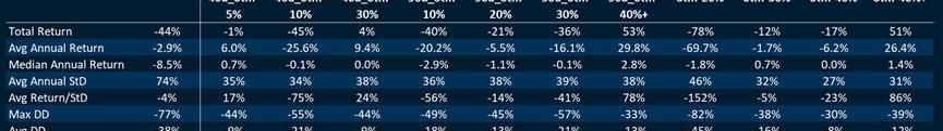 看一下三個月的追蹤90分位數的進入門檻和三個月的追蹤10分位數的退出門檻,我們發現,在測試的11個指標中,有九個在總回報和最大縮減方面擊敗了買入并持有策略,其中四個顯著超越。