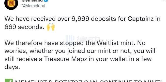 在發售開始后十幾分鐘官方便宣布已經收到了超過9,999筆存款,宣告Waitlist鑄造已經終止,「擔保鑄造」則不受影響,在48小時內完成鑄造即可。