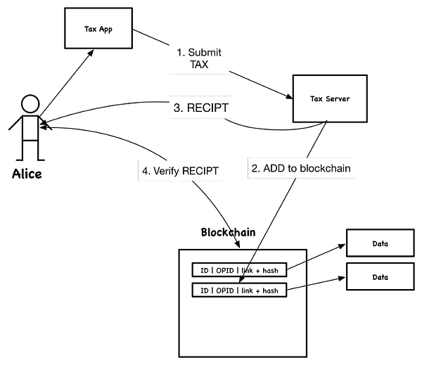 例如,假設Alice想繳稅。Tax Server接受付款應用程序,創建數字收據,將其哈希記錄在區塊鏈中,然后將收據發送給Alice。Alice可以通過計算哈希值并檢查存儲在區塊鏈中的值來驗證收據。此后,Bob無法拒絕收據,因為收據哈希值和時間記錄在區塊鏈中。
