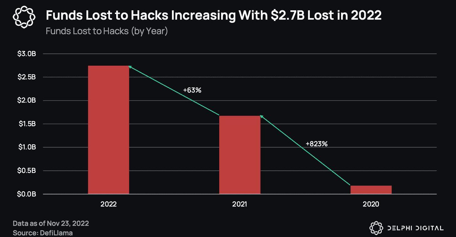 黑客們發現了協議架構或智能合約中的缺陷,并找到了從這些缺陷中提取價值的方法。自2020年DeFisummer開始以來,被盜資金的數量只增不減。僅在2022年,因黑客攻擊而損失的資金就已經有27億美元,比去年增加了63%。