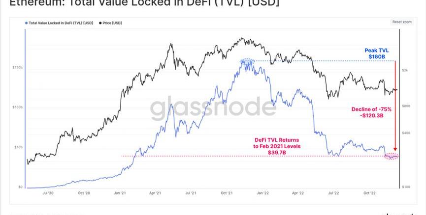 由于代幣價格大幅下跌,流動性嚴重收縮,鎖定在DeFi中的總價值急劇下降。在2021年11月ATH市場達到1600億美元的峰值后,DeFiTVL下降了超過1203億美元(-75%)。這使DeFi抵押品價值降至397億美元,回到2021年2月的水平。
