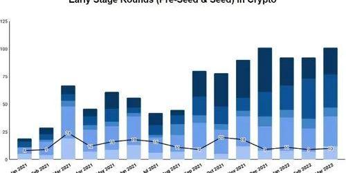 下圖按月顯示了從2021年1月到2022年3月的早期融資輪數,以及該隊列中已經進行后續融資的公司數量。我們選擇這個時間框架的原因是它最能代表加密風險投資中當前的種子景觀——它包括新興的管理者和現任者。我們排除了2022年3月之后的新公司隊列,因為這些隊列中的公司還不夠成熟,通常無法保證進行后續輪次。