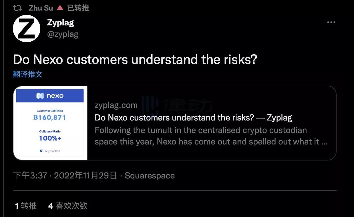 沒有獲得借款的三箭前掌門人ZhuSu曾在幾日前轉發質疑Nexo風險的推特Zyplag發布的推文,似乎在暗示什么。