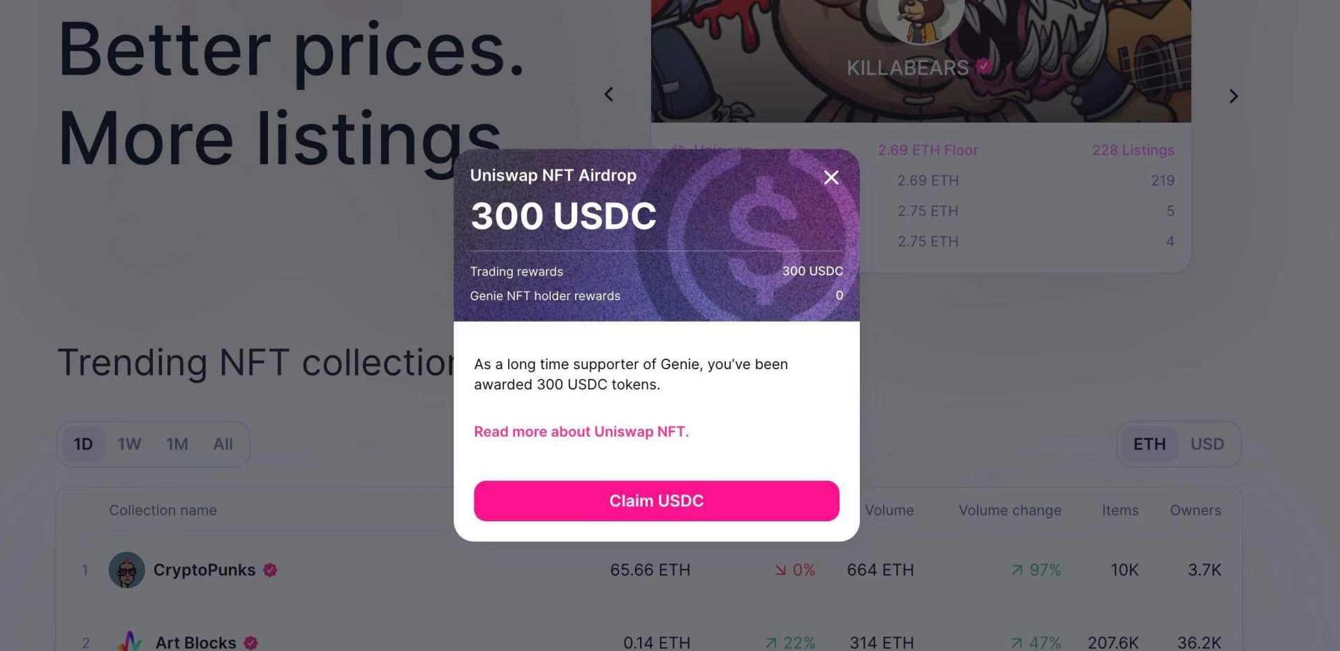 XRP/HKD-2.64%UniswapLabs在11月30日發推宣布,其NFT交易聚合服務正式在Uniswap上線。此外還向Genie的歷史用戶空投約500萬美元的USDC,并向前22,000名買家提供Gas回扣。空投條件相對寬松,凡是在4月15日前在Genie有兩筆及兩筆以上的用戶,以及GenesisNFT的持有人都可以領取空投。目前用戶可至Uniswap官網領取USDC獎勵。