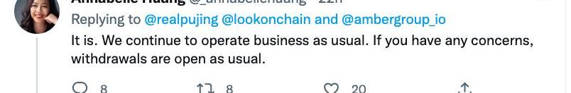 值得注意的是,Amber管理合伙人AnnabelleHuang曾回復上述Lookonchain推文,稱「資金安全,我們繼續照常營業。提現照常開放。」